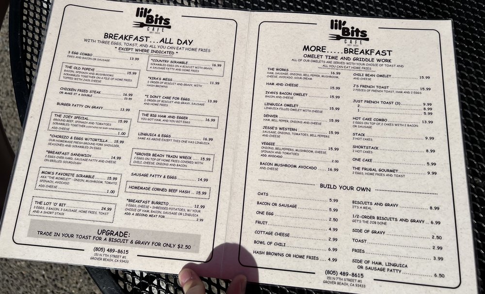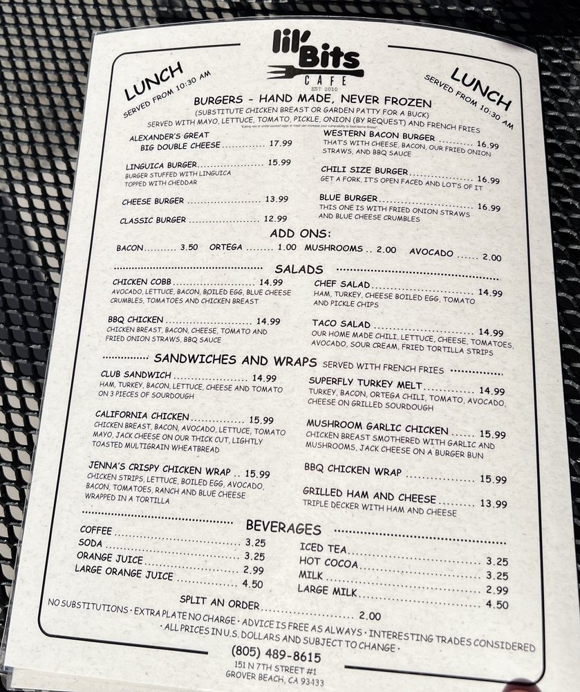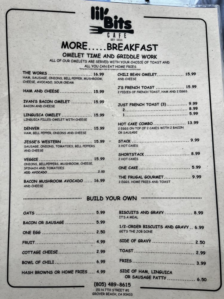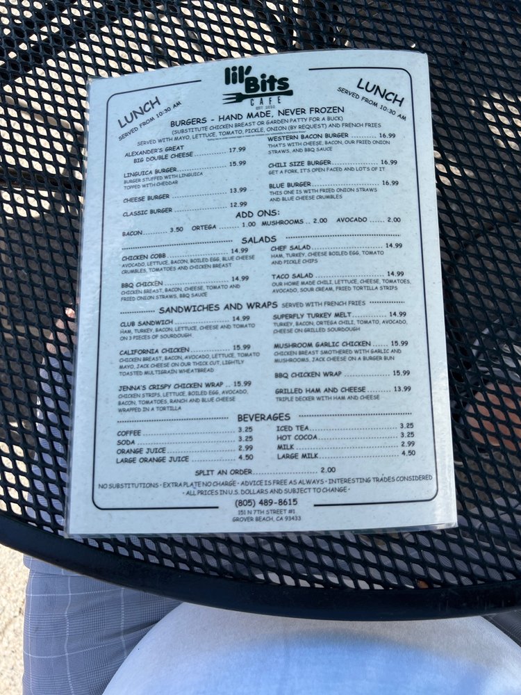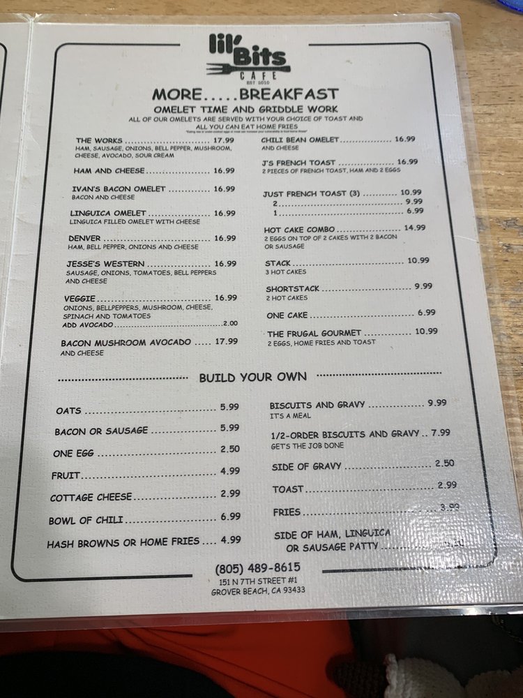 Introducing the menu at Lil'Bits, a cozy American restaurant located in Grover Beach, CA. This spot offers a variety of breakfast, brunch, and sandwich options, with a focus on vegetarian choices. The restaurant provides takeout, reservation options, and even catering services. With amenities like outdoor seating, Wi-Fi, and gender-neutral restrooms, Lil'Bits caters to a diverse range of customers. The casual atmosphere with moderate noise levels makes it ideal for groups, families, and even kids. The menu features happy hour specials, alcohol beverages, and waitstaff service. Whether you're looking for a quick bite or a leisurely meal, Lil'Bits has something for everyone. Don't miss out on the chance to indulge in their delicious offerings at 151 N 7th St Ste 1 Grover Beach, CA 93433.