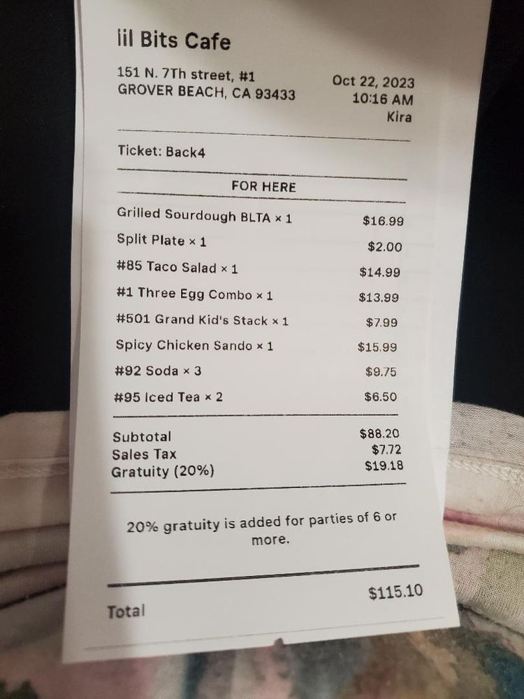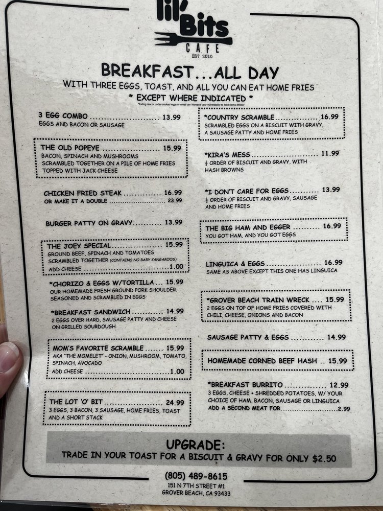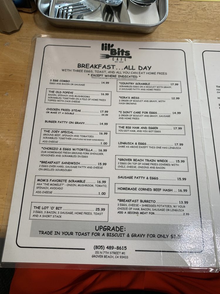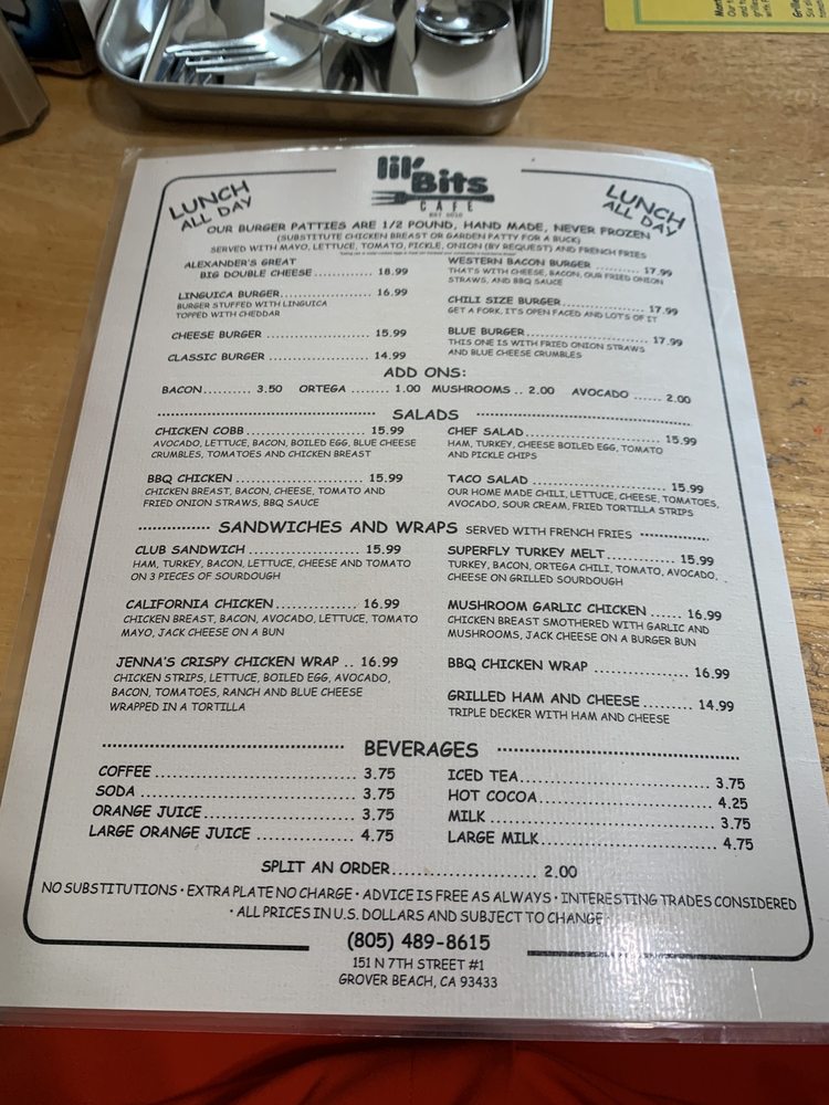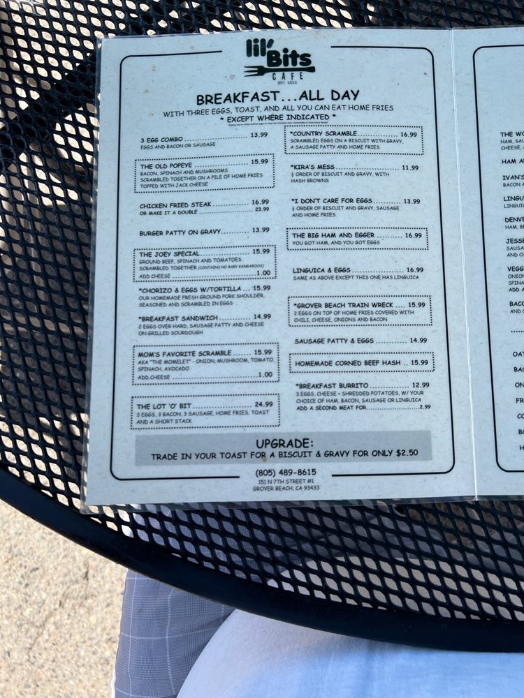 Introducing the menu at Lil'Bits, a cozy American restaurant located in Grover Beach, CA. This spot offers a variety of breakfast, brunch, and sandwich options, with a focus on vegetarian choices. The restaurant provides takeout, reservation options, and even catering services. With amenities like outdoor seating, Wi-Fi, and gender-neutral restrooms, Lil'Bits caters to a diverse range of customers. The casual atmosphere with moderate noise levels makes it ideal for groups, families, and even kids. The menu features happy hour specials, alcohol beverages, and waitstaff service. Whether you're looking for a quick bite or a leisurely meal, Lil'Bits has something for everyone. Don't miss out on the chance to indulge in their delicious offerings at 151 N 7th St Ste 1 Grover Beach, CA 93433.